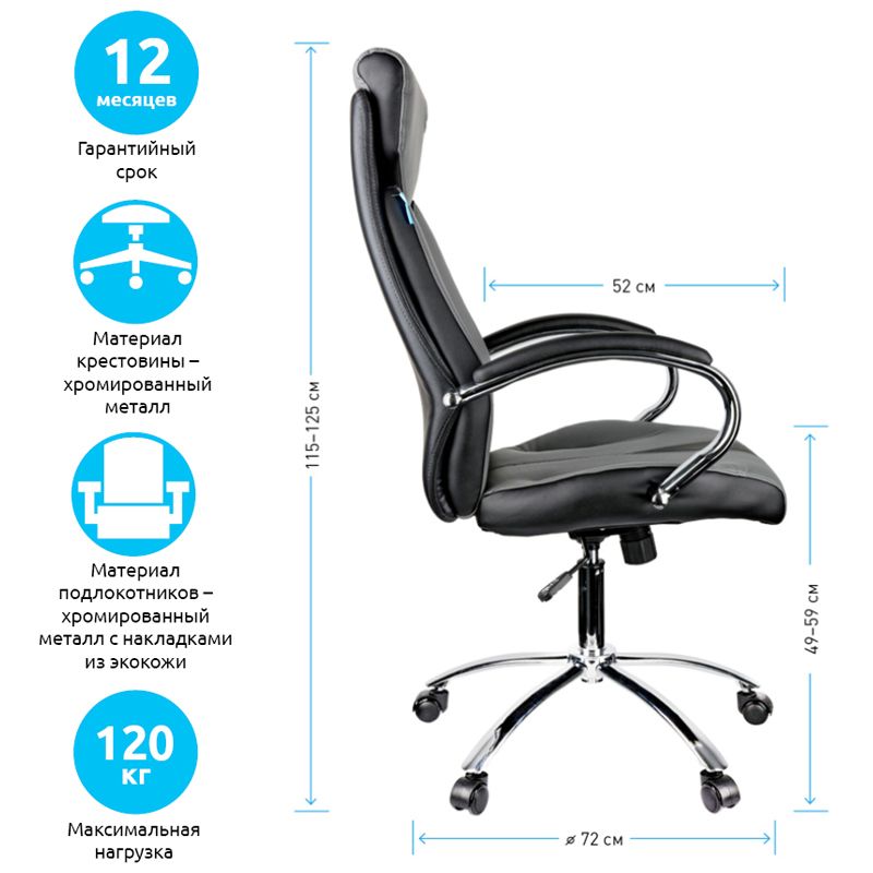Механизм качания с возможностью фиксации кресла в рабочем положении. Каркас – немонолитный, материал набивки – вспененный полиуретан, крестовина – хромированный металл, материал обивки – чёрно-серая экокожа. Гарантийный срок – 12 месяцев.