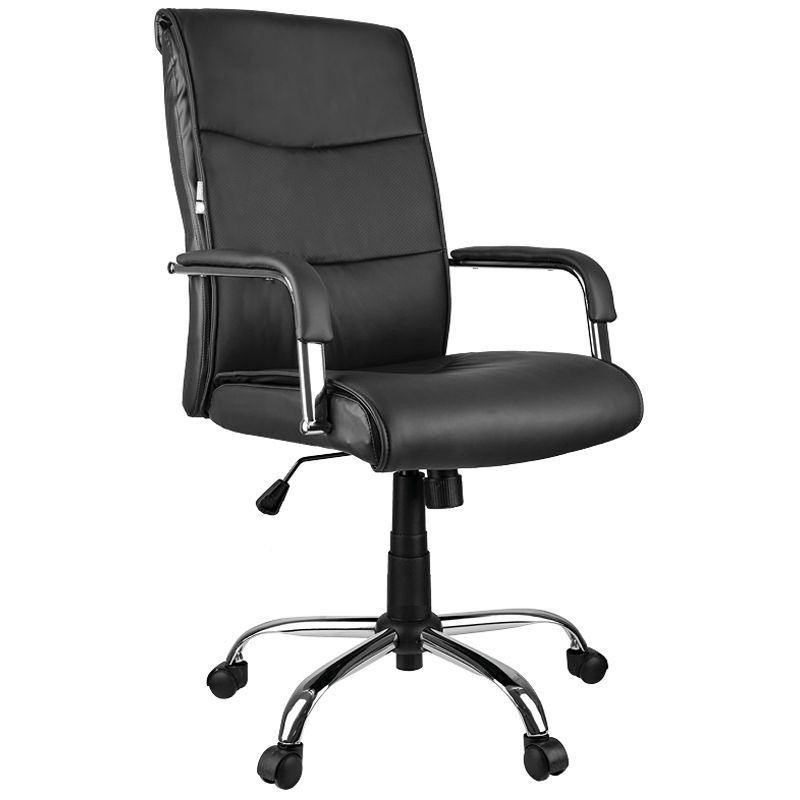 Классические прямые формы удачно оттеняются хромированными элементами и вставками из перфорированной экокожи. Механизм качания с возможностью фиксации кресла в рабочем положении. Каркас – немонолитный, материал набивки – вспененный полиуретан, крестовина – хромированный металл. Гарантийный срок – 12 месяцев.