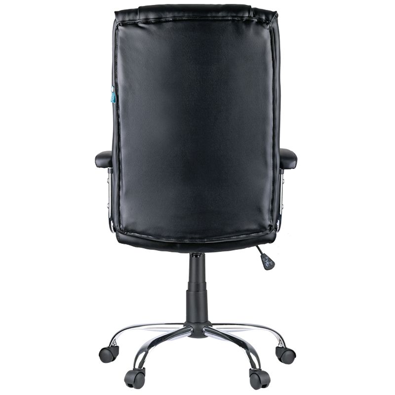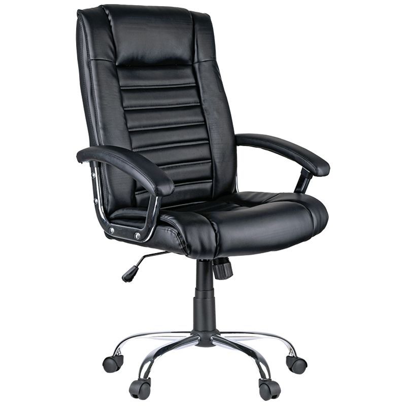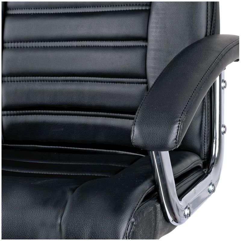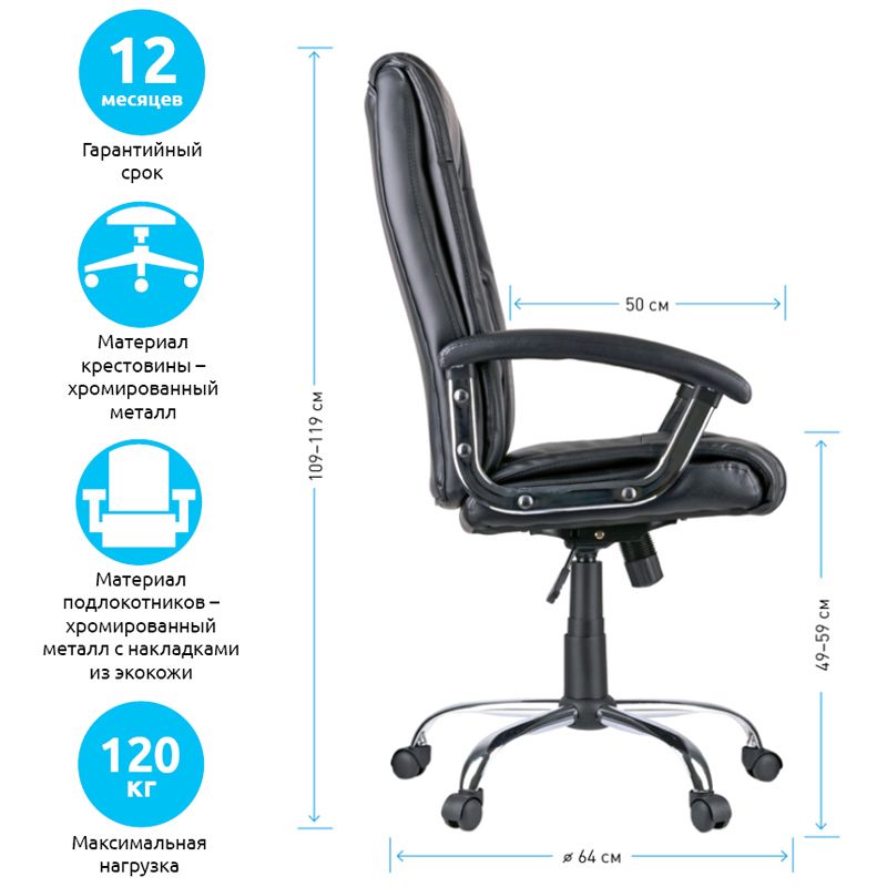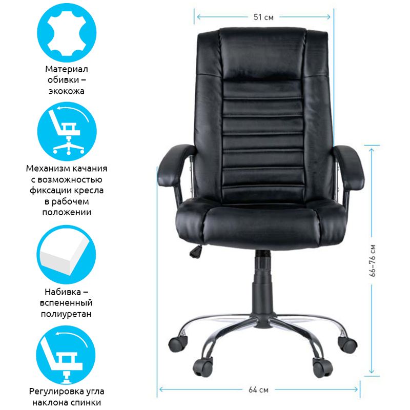 Харизматичное кресло с хромированными элементами и стильной отстрочкой, формирующей рельефный профиль спинки и сиденья. Каркас – немонолитный, материал набивки – вспененный полиуретан, крестовина – хромированный металл, материал обивки – экокожа чёрного цвета. Модель имеет металлические хромированные подлокотники с накладками из экокожи. Механизм качания с возможностью фиксации кресла в рабочем положении. Гарантийный срок – 12 месяцев.