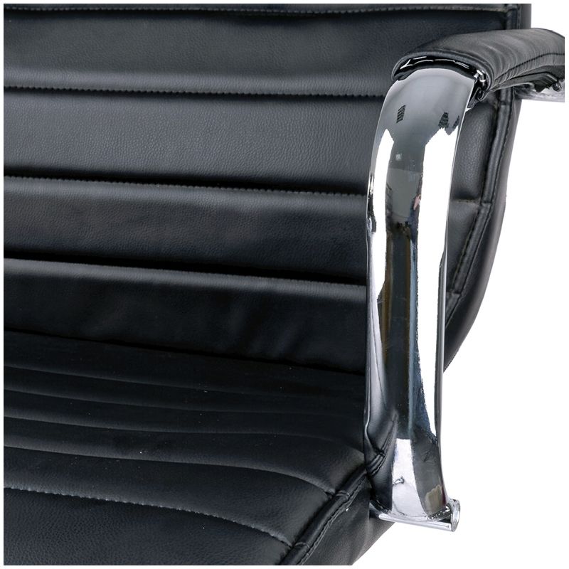 Каркас – немонолитный, материал набивки – вспененный полиуретан, крестовина – хромированный металл, материал обивки – экокожа чёрного цвета. Модель имеет металлические хромированные подлокотники с накладками из экокожи. Особенность этой модели – регулируемый подголовник. Механизм качания с возможностью фиксации кресла в рабочем положении. Гарантийный срок – 12 месяцев.