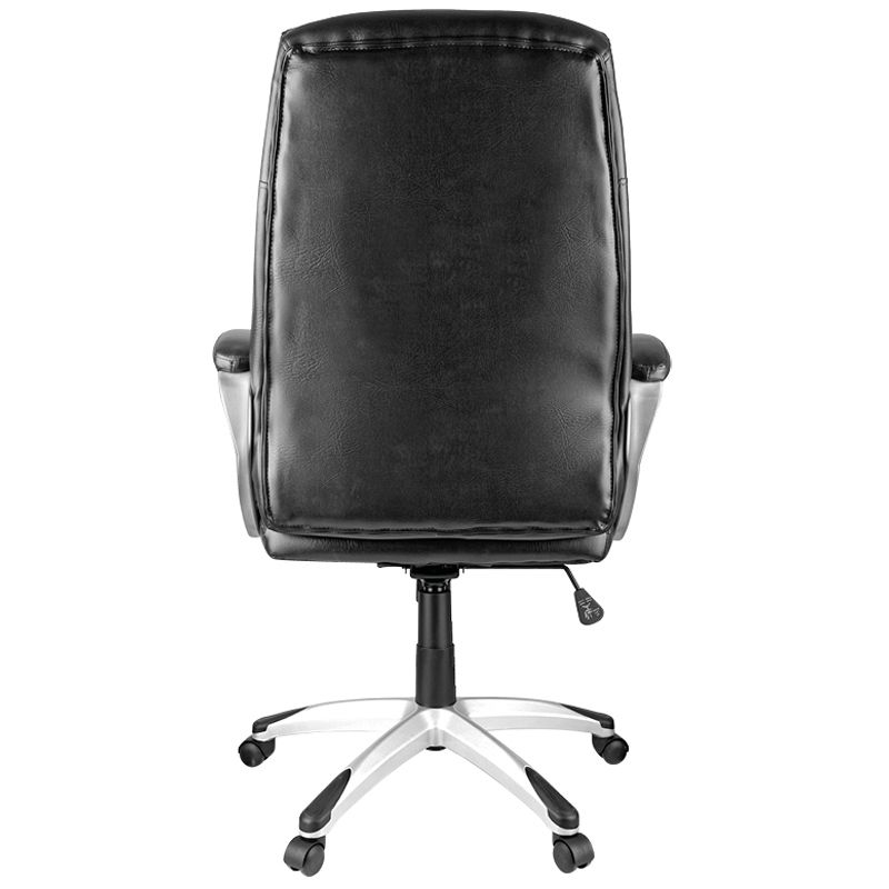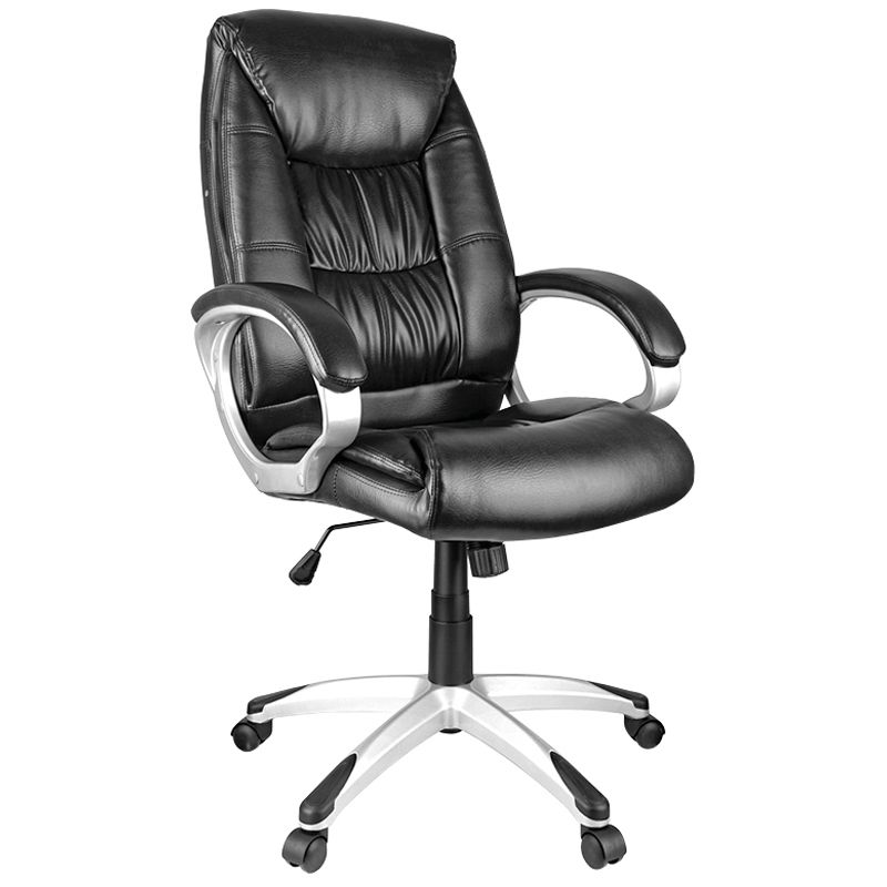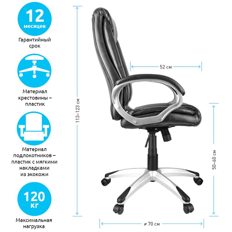 Сочетание классической формы и слегка «небрежного» стиля обивки делает кресло уместным как для консервативно-сдержанных интерьеров, так и для более свободных и современных. Каркас – немонолитный, материал набивки – вспененный полиуретан, крестовина – пластик серебристого цвета, подлокотники с мягкими накладками из экокожи, материал обивки – экокожа чёрного цвета. Гарантийный срок – 12 месяцев.