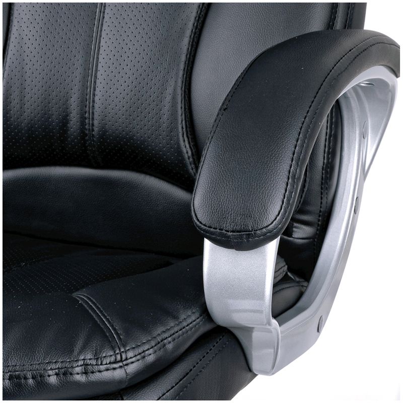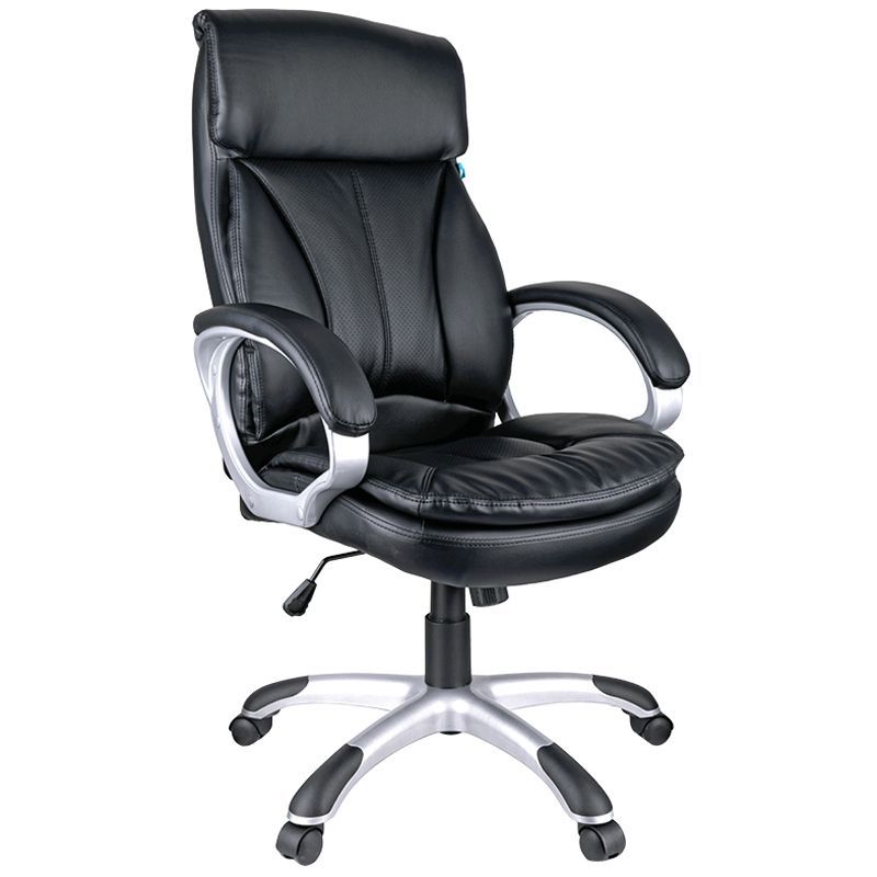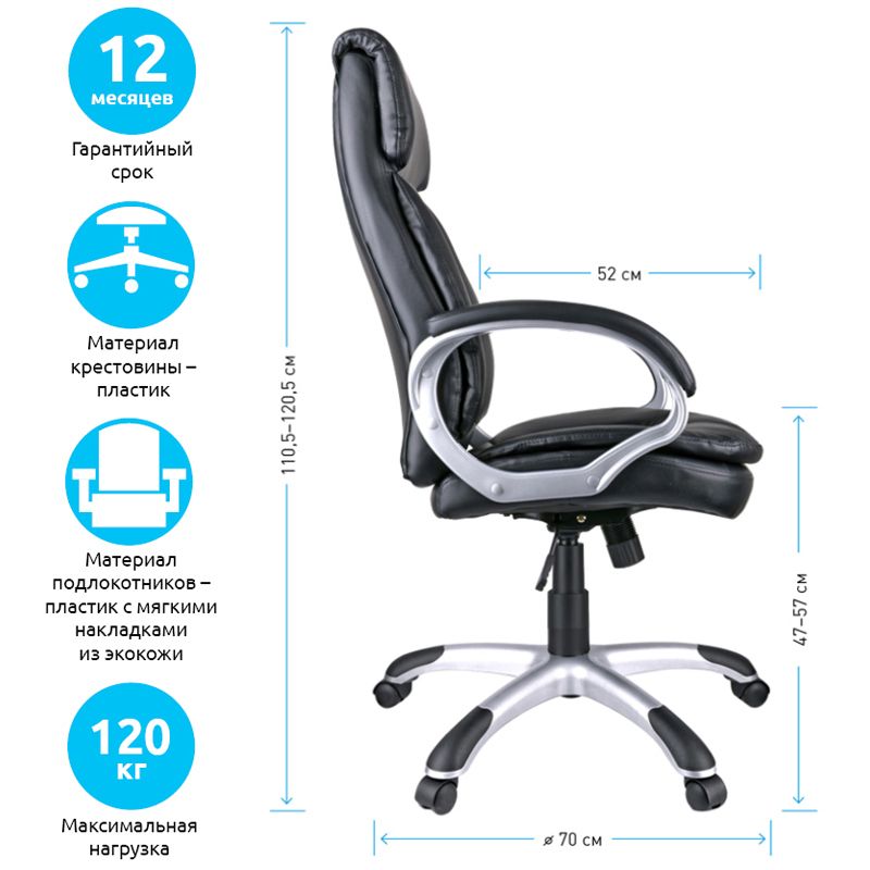 Большое и удобное кресло со свежим дизайном и выверенной эргономикой. Каркас – немонолитный, материал набивки – вспененный полиуретан, крестовина – пластик серебристого цвета, материал обивки – экокожа чёрного цвета. Модель имеет пластиковые подлокотники с мягкими накладками из экокожи. Гарантийный срок – 12 месяцев.