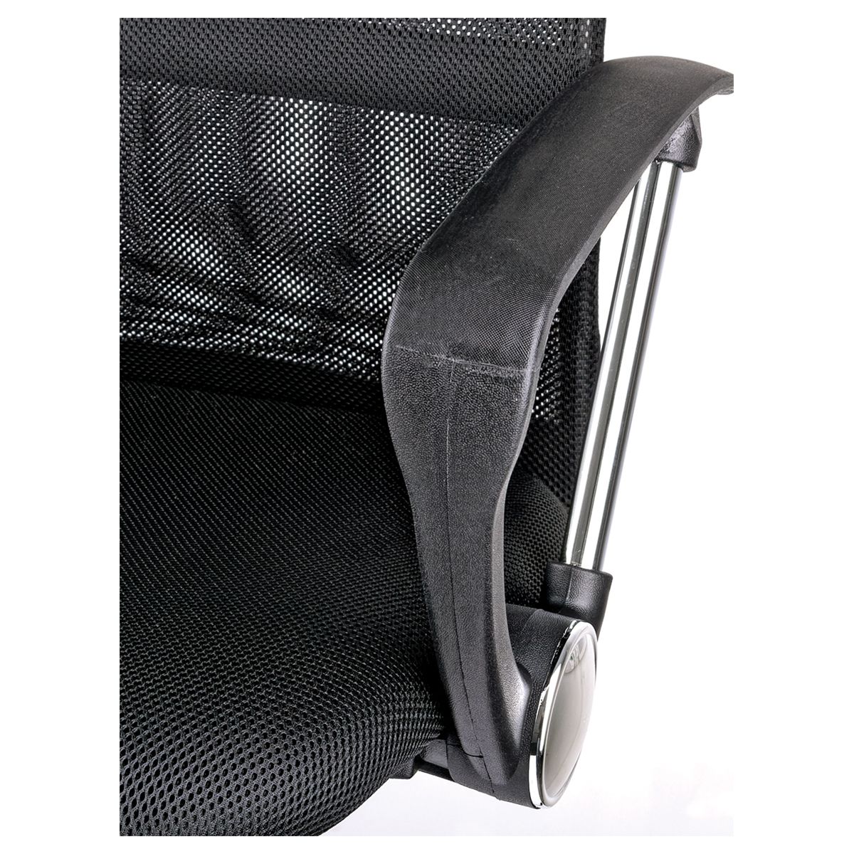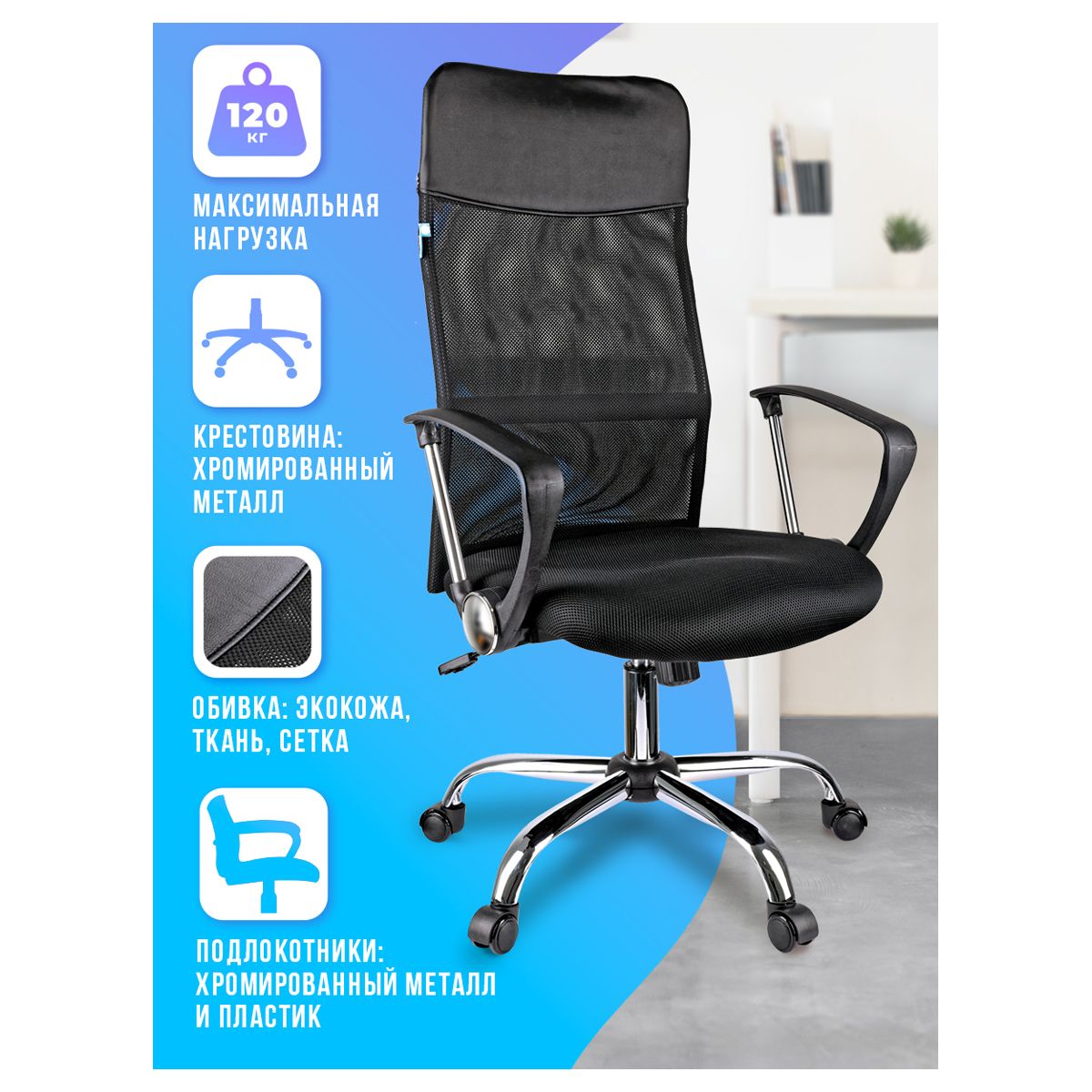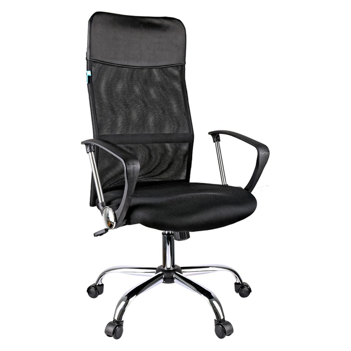 Высокая «сетчатая» спинка с анатомичным изгибом обеспечивает идеальную поддержку, отличную вентиляцию и позволит сохранить чувство свежести в «жаркие» рабочие дни. Механизм качания с возможностью фиксации кресла в рабочем положении. Каркас – немонолитный, материал набивки – вспененный полиуретан, материал обивки сиденья – ткань черная, спинки – ткань-сетка черная с подголовником из экокожи, подлокотники пластиковые с хромированными элементами, крестовина – хромированный металл. Гарантийный срок – 12 месяцев.