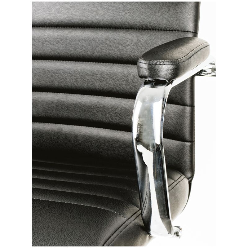 Легкий «тонкий» профиль и хромированные подлокотники вносят в классический образ стильные «хайтековские» штрихи. Механизм качания с возможностью фиксации кресла в рабочем положении. Каркас – немонолитный, материал набивки – вспененный полиуретан, крестовина – хромированный металл, материал обивки – чёрная экокожа. Гарантийный срок – 12 месяцев.