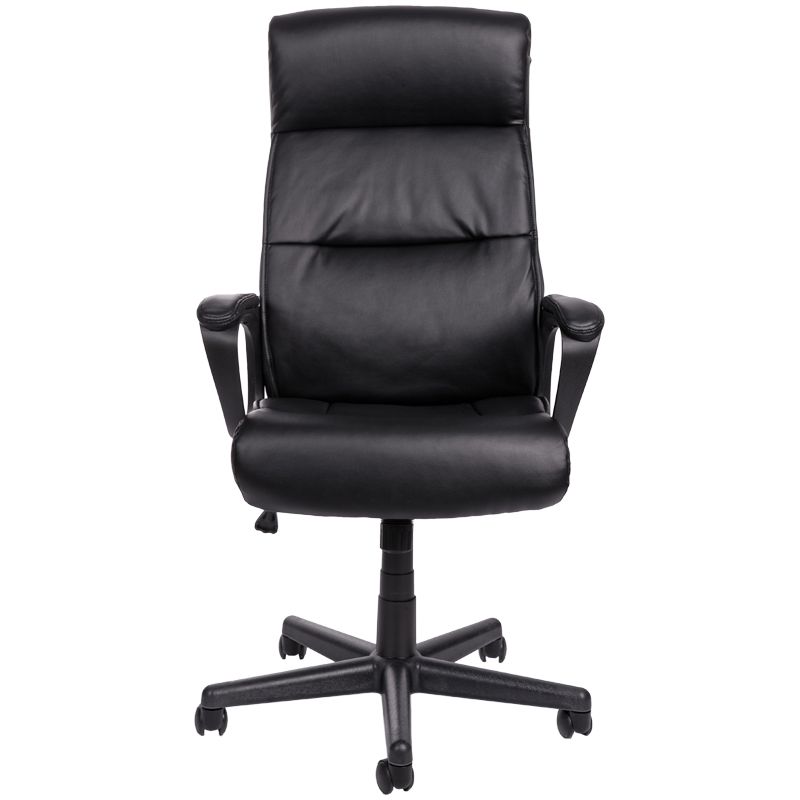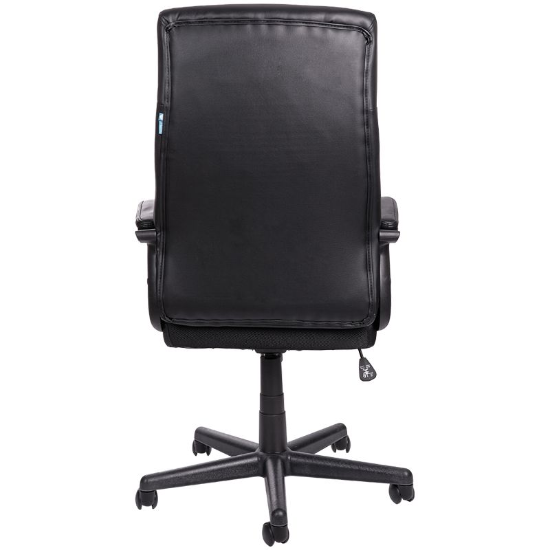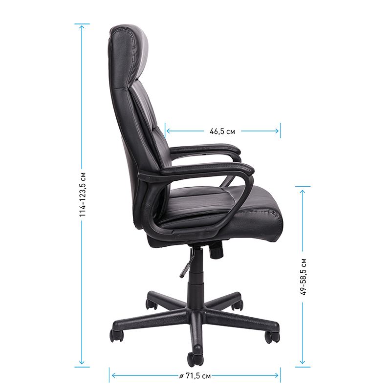 Максимальная нагрузка составляет 120 кг. Газпатрон 3 класс по стандарту BIFMA X5.1. Каркас – немонолитный, материал набивки – вспененный полиуретан, крестовина – пластик, материал обивки – экокожа чёрного цвета. Модель имеет пластиковые подлокотники с накладками из экокожи. Механизм качания с возможностью фиксации кресла в рабочем положении. Гарантийный срок – 12 месяцев.
