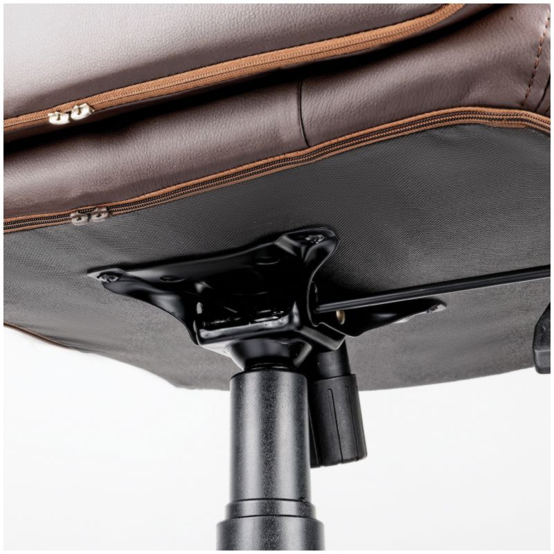 Контрастное выделение элементов спинки и сиденья добавляет дизайну солидности и лоска, делая его образцом бизнес-классики. Каркас – немонолитный, материал набивки – вспененный полиуретан, крестовина – пластик, материал обивки – экокожа коричневого цвета. Модель имеет пластиковые подлокотники с мягкими накладками. Гарантийный срок – 24 месяца.