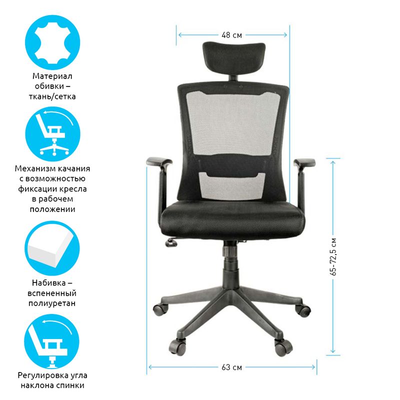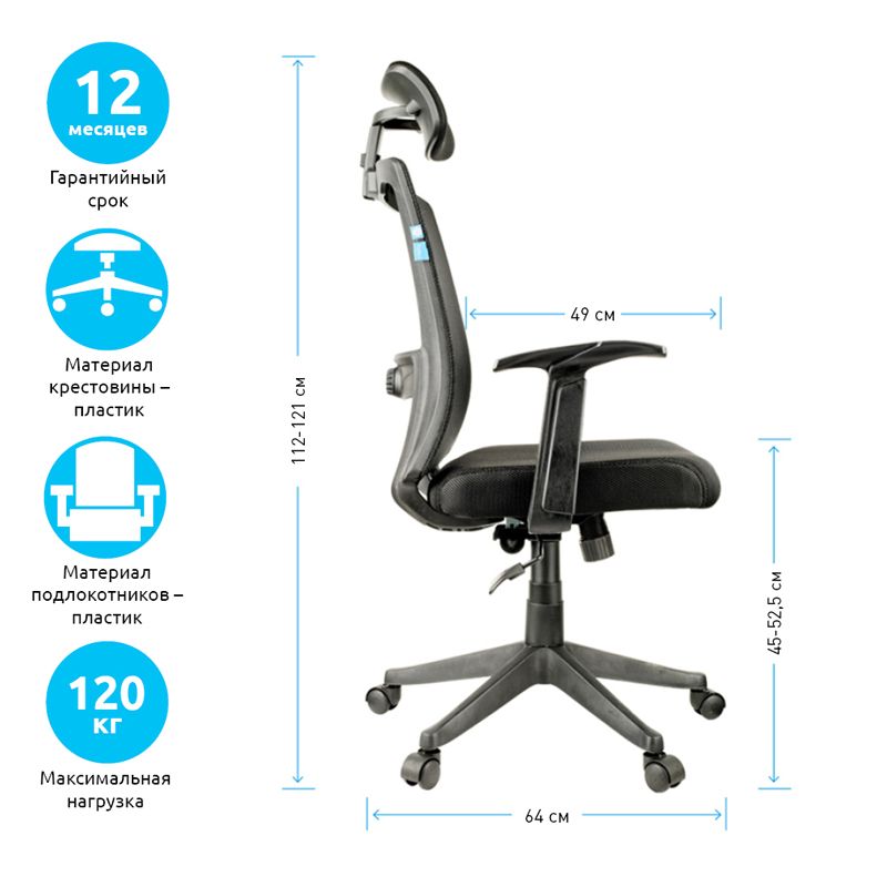 Максимальная нагрузка составляет 120 кг. Газпатрон 3 класса по стандарту BIFMA X5.1. Каркас – немонолитный, материал набивки – вспененный полиуретан, крестовина – пластик, материал обивки – ткань/сетка чёрного цвета. Модель имеет пластиковые подлокотники. Механизм качания «Люкс» с возможностью фиксации кресла в нескольких положениях. Гарантийный срок – 12 месяцев.