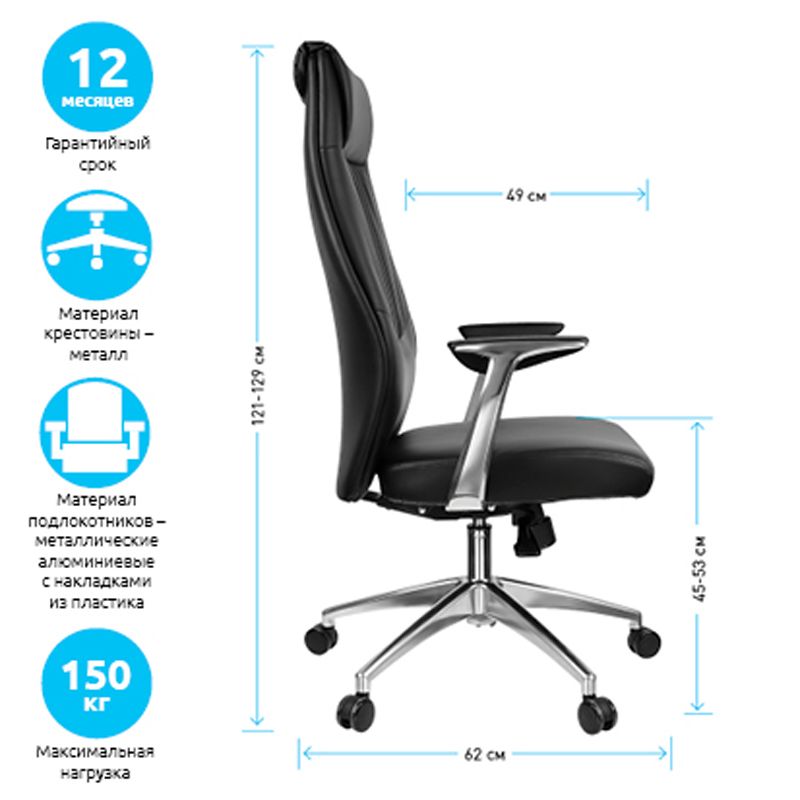 Каркас – немонолитный, материал набивки – вспененный полиуретан, крестовина – металл, материал обивки – экокожа чёрного цвета. Модель имеет металлические алюминиевые с накладками из экокожи. Газпатрон 4 категории по стандарту Germany DIN 4550.