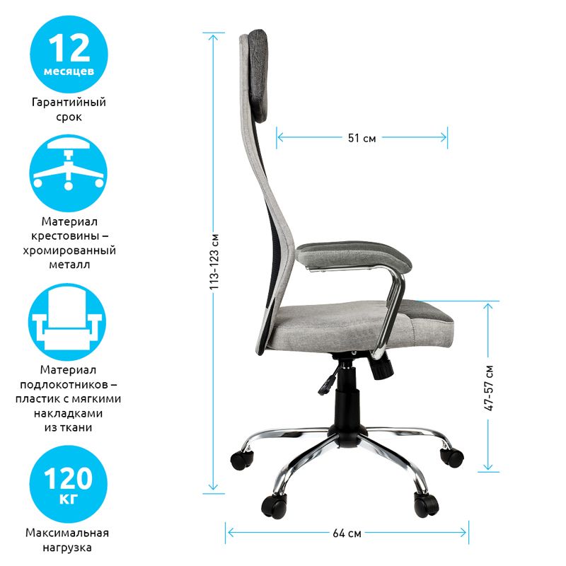 Максимальная нагрузка составляет 120 кг. Газпатрон 2 класса по стандарту BIFMA X5.1. Каркас – немонолитный, материал набивки – поролон, крестовина – хромированный металл, подлокотники – металлические хромированные с накладками из ткани, материал обивки – ткань и сетка. Механизм качания с возможностью фиксации кресла в рабочем положении. Гарантийный срок – 12 месяцев.