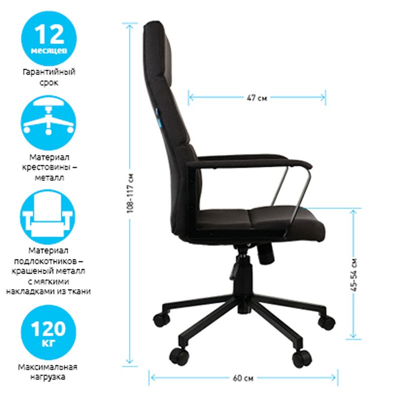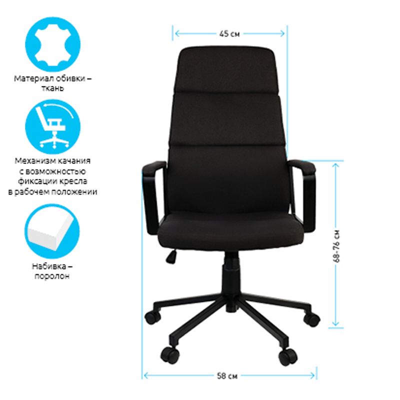 Эргономичная форма спинки и сиденья в сочетании с плотной набивкой из поролона обеспечивает комфорт в процессе эксплуатации. Обивка выполнена из высококачественной мебельной ткани. Это один из лучших вариантов среди кресел руководителя базового уровня.