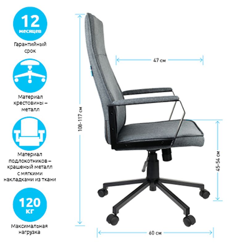 Эргономичная форма спинки и сиденья в сочетании с плотной набивкой из поролона обеспечивает комфорт в процессе эксплуатации. Обивка выполнена из высококачественной мебельной ткани. Это один из лучших вариантов среди кресел руководителя базового уровня.
