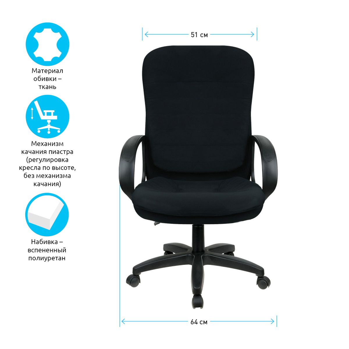 Кресло выполнено в обивке из износостойкой и практичной ткани черного цвета, что делает его отличным решением как для оснащения офиса, так и домашнего кабинета.