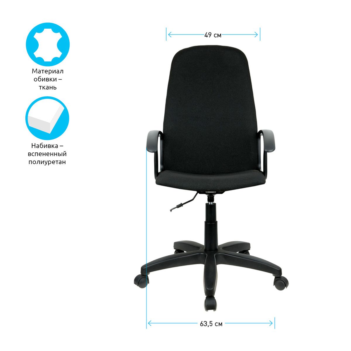 Максимальная нагрузка составляет 100 кг. Газпатрон 2 категории по стандарту Germany DIN 4550. Каркас – немонолитный, материал набивки – вспененный полиуретан, крестовина – пластик, подлокотники – пластик, материал обивки – практичная и износостойкая ткань чёрного цвета. Регулировка по высоте позволяет настроить сиденье под конкретного пользователя. Гарантийный срок –24 месяца.