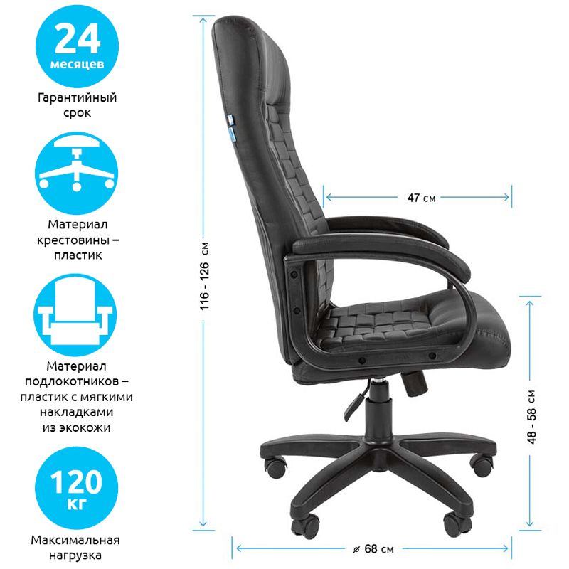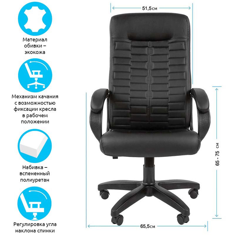 Каркас – немонолитный, материал набивки – вспененный полиуретан, крестовина – пластик, материал обивки – экокожа чёрного цвета. Модель имеет пластиковые подлокотники с мягкими накладками. Гарантийный срок – 24 месяца.