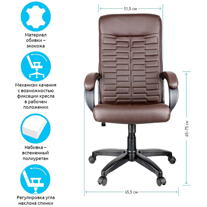 Каркас – немонолитный, материал набивки – вспененный полиуретан, крестовина – пластик, материал обивки – экокожа коричневого цвета. Модель имеет пластиковые подлокотники с мягкими накладками. Гарантийный срок – 24 месяца.