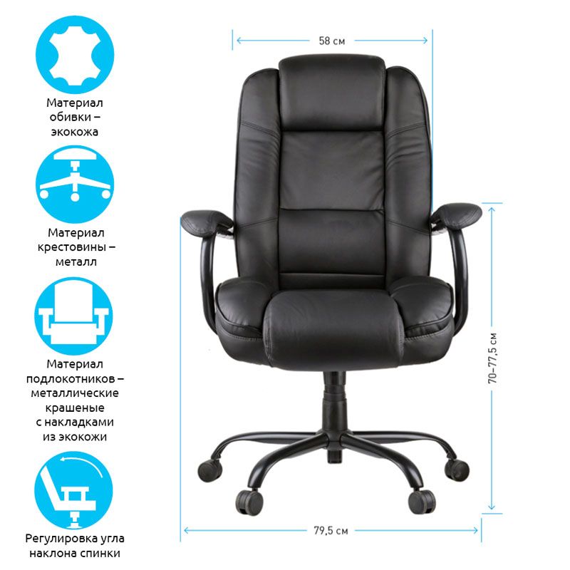 Применение комплектующих повышенной прочности позволяет креслу выдерживать нагрузку до 200 кг. Просторная эргономичная спинка с боковой поддержкой и подголовником обеспечит исключительное удобство даже XXL-пользователям. Механизм качания с возможностью фиксации кресла в рабочем положении. Каркас – немонолитный, материал набивки – вспененный полиуретан, крестовина – металл, материал обивки – чёрная экокожа. Гарантийный срок – 12 месяцев.