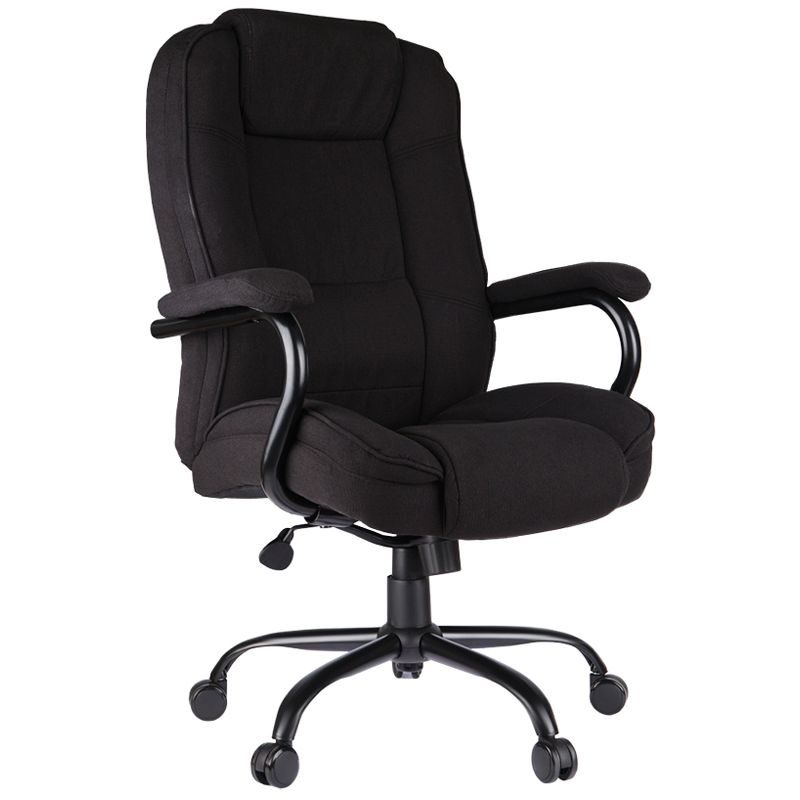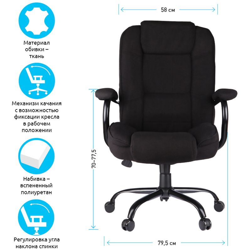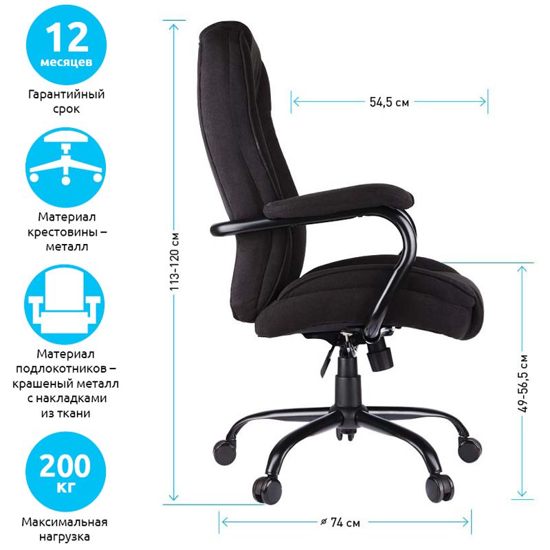 Применение комплектующих повышенной прочности позволяет креслу выдерживать нагрузку до 200 кг. Просторная эргономичная спинка с боковой поддержкой и подголовником обеспечит исключительное удобство даже XXL-пользователям. Механизм качания с возможностью фиксации кресла в рабочем положении. Каркас – немонолитный, материал набивки – вспененный полиуретан, крестовина – металл, материал обивки – чёрно-серая ткань. Гарантийный срок – 12 месяцев.