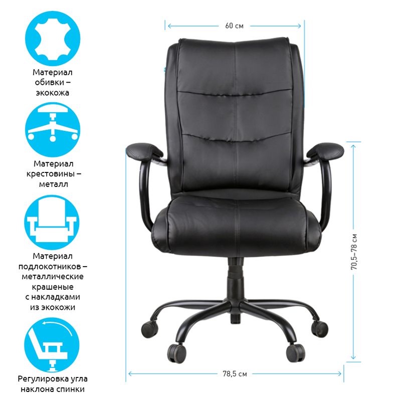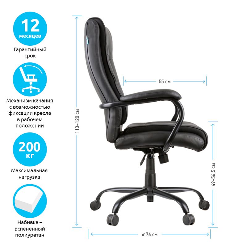 Применение комплектующих повышенной прочности позволяет креслу выдерживать нагрузку до 200 кг. Просторная эргономичная спинка с боковой поддержкой и подголовником обеспечит исключительное удобство даже XXL-пользователям. Механизм качания с возможностью фиксации кресла в рабочем положении. Каркас – немонолитный, материал набивки – вспененный полиуретан, крестовина – металл, материал обивки – чёрная экокожа. Гарантийный срок – 12 месяцев.