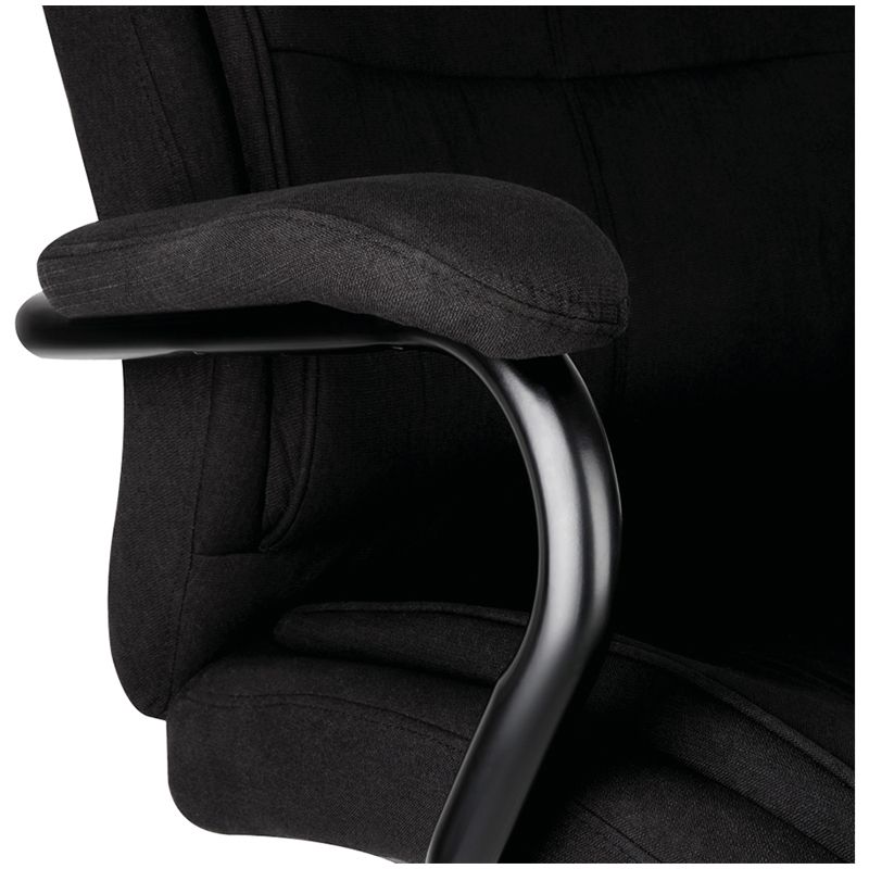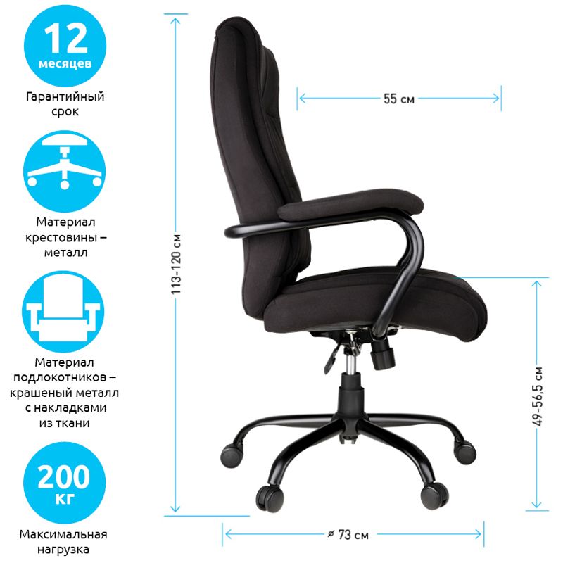 Применение комплектующих повышенной прочности позволяет креслу выдерживать нагрузку до 200 кг. Просторная эргономичная спинка с боковой поддержкой и подголовником обеспечит исключительное удобство даже XXL-пользователям. Механизм качания с возможностью фиксации кресла в рабочем положении. Каркас – немонолитный, материал набивки – вспененный полиуретан, крестовина – металл, материал обивки – чёрно-серая ткань. Гарантийный срок – 12 месяцев.