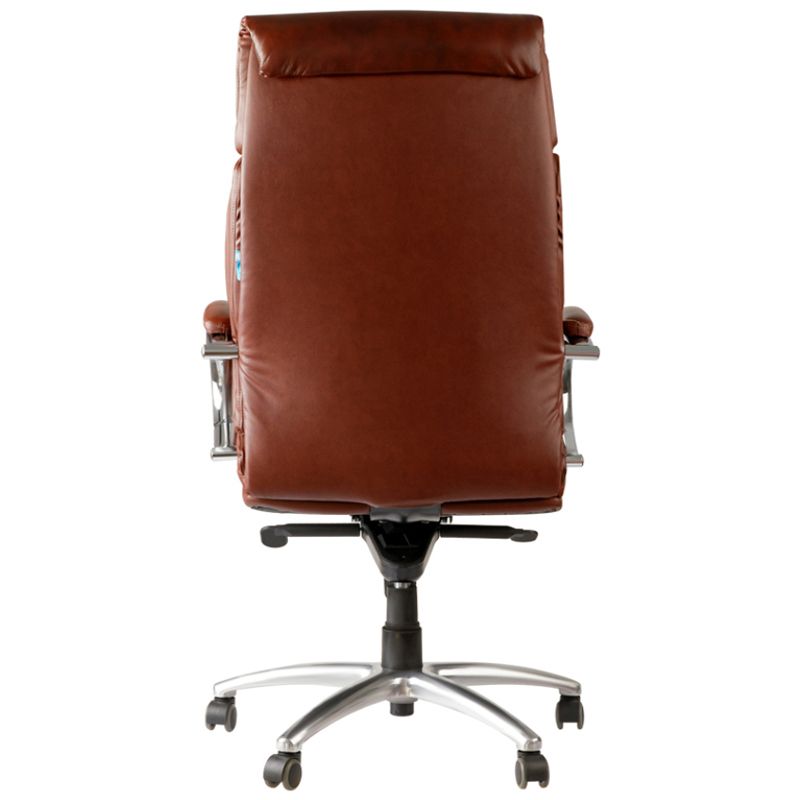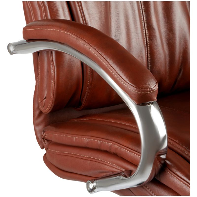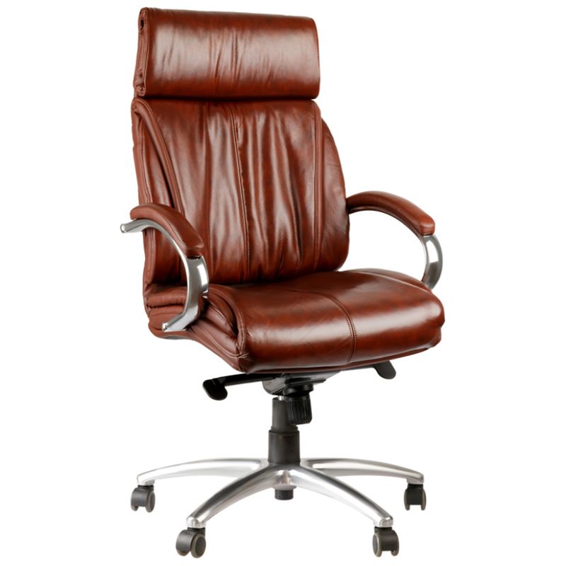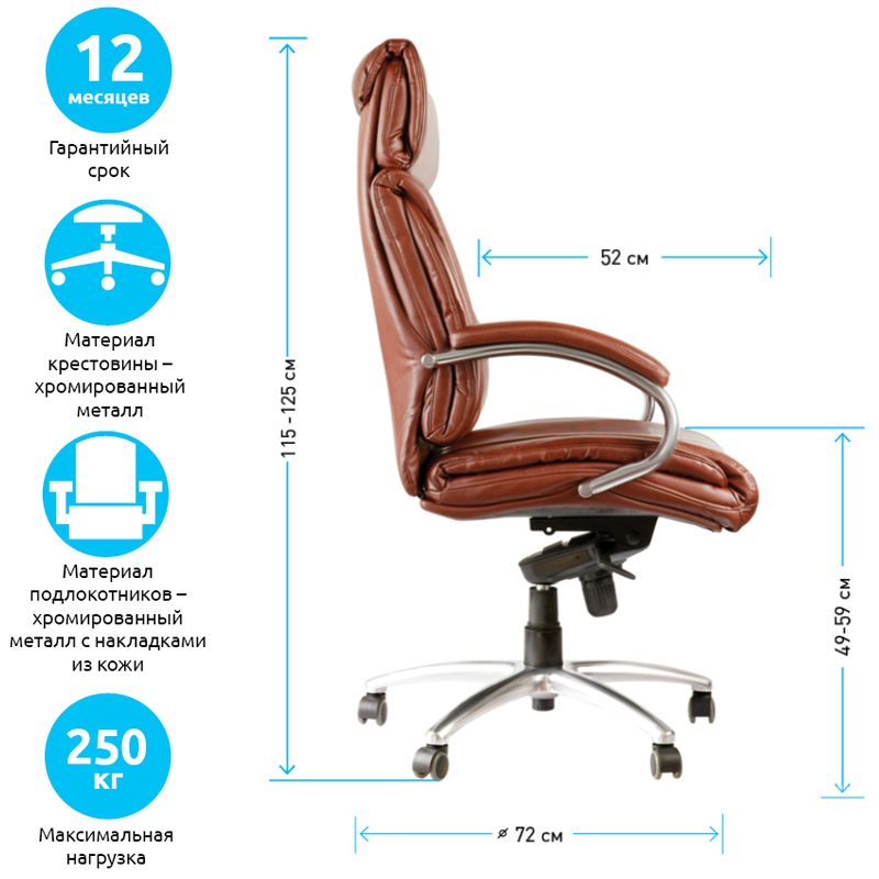 Каркас – немонолитный, материал набивки – вспененный полиуретан, крестовина – хромированный металл, материал обивки – кожа бордового цвета. Модель имеет металлические хромированные подлокотники с накладками из кожи. Газпатрон 4 категории по стандарту Germany DIN 4550. Гарантийный срок – 24 месяца.