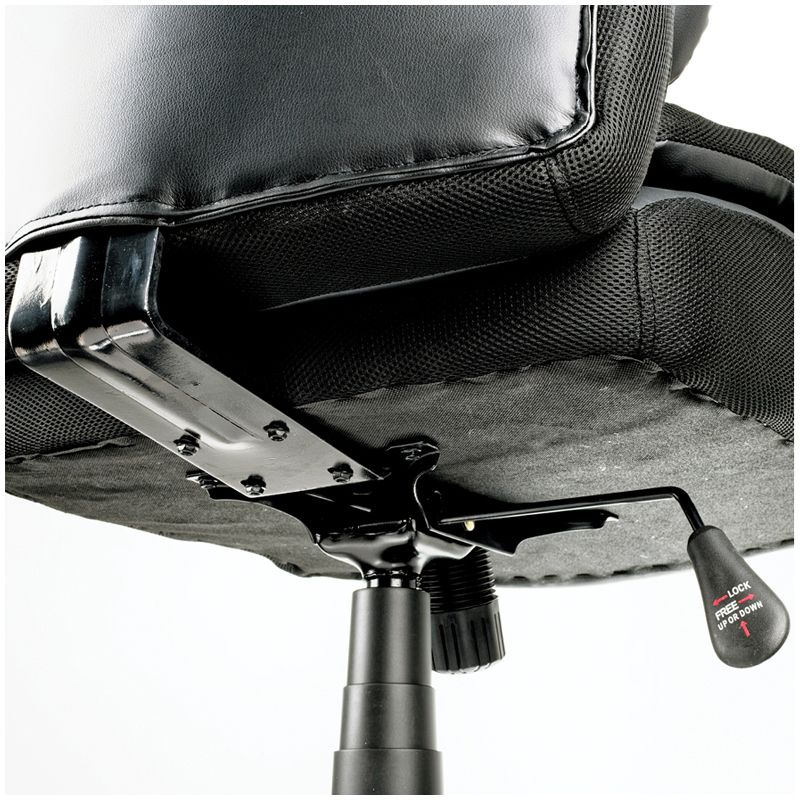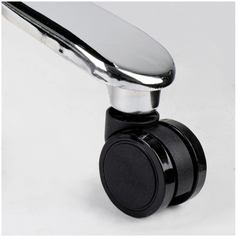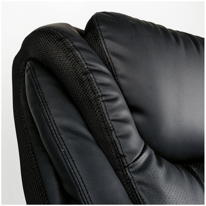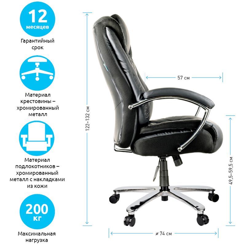 Газпатрон 4 категории по стандарту Germany DIN 4550. Каркас – немонолитный, материал набивки – вспененный полиуретан, крестовина – хромированный металл, материал обивки – экокожа чёрного цвета. Модель имеет металлические хромированные подлокотники с накладками из экокожи. Механизм качания с возможностью фиксации кресла в рабочем положении. Гарантийный срок – 12 месяцев.