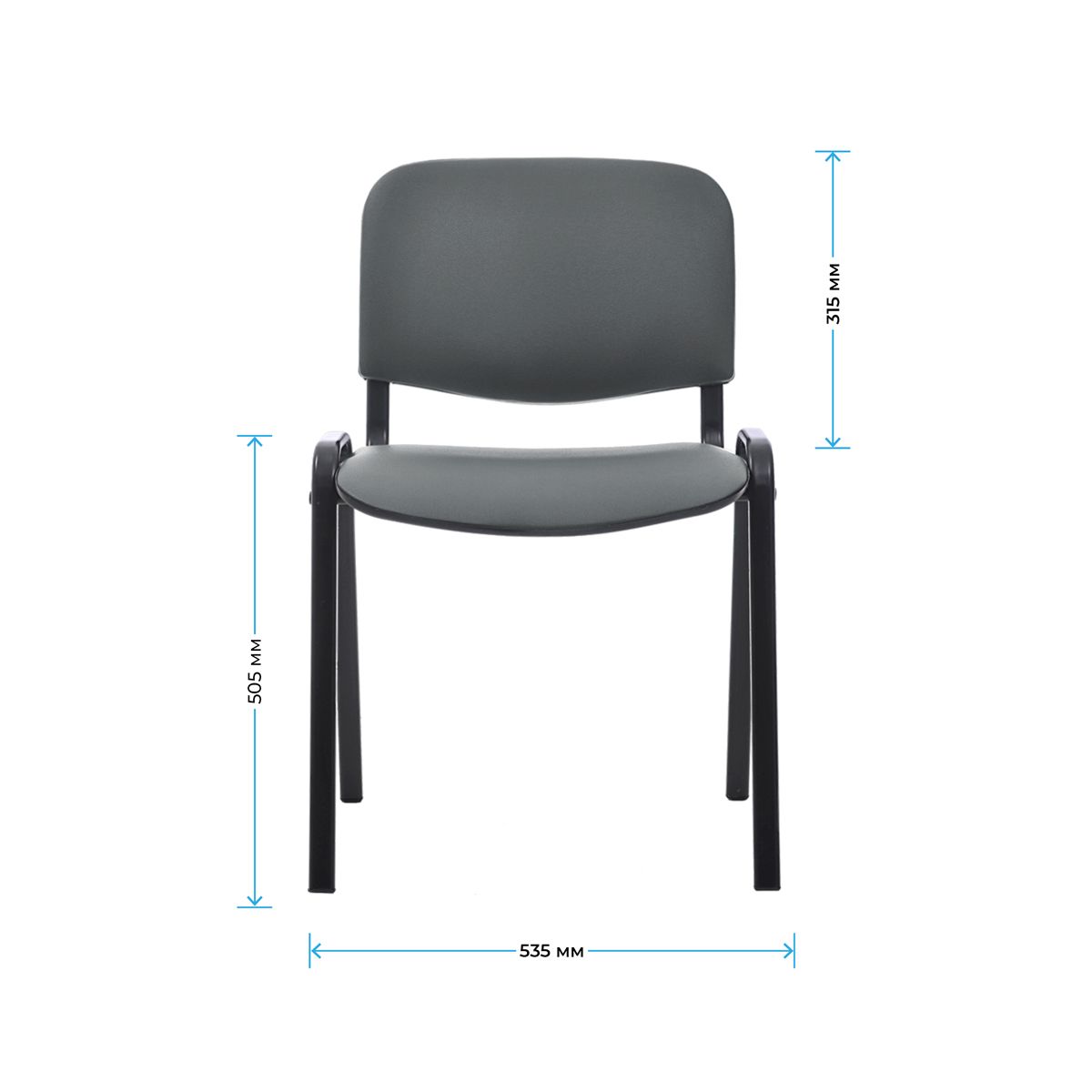Набивка – высокоупругий поролон. Каркас – устойчивая металлическая конструкция. Ножки и дуги – плоскоовальная труба сечением 30х15 мм и толщиной стенок – 1,2 мм. Покрытие рамы – термореактивная порошковая краска чёрного цвета, стойкая к царапинам и сколам. На ножках есть пластиковые заглушки. Спинка сзади и сиденье снизу закрыты пластиковыми чехлами. Он подходит не только для офисных помещений, но и для заведений общественного питания, гостиниц, конференц-залов или как компьютерный стул для дома. Конструкция каркаса позволяет убирать стулья в стопки для экономии пространства.