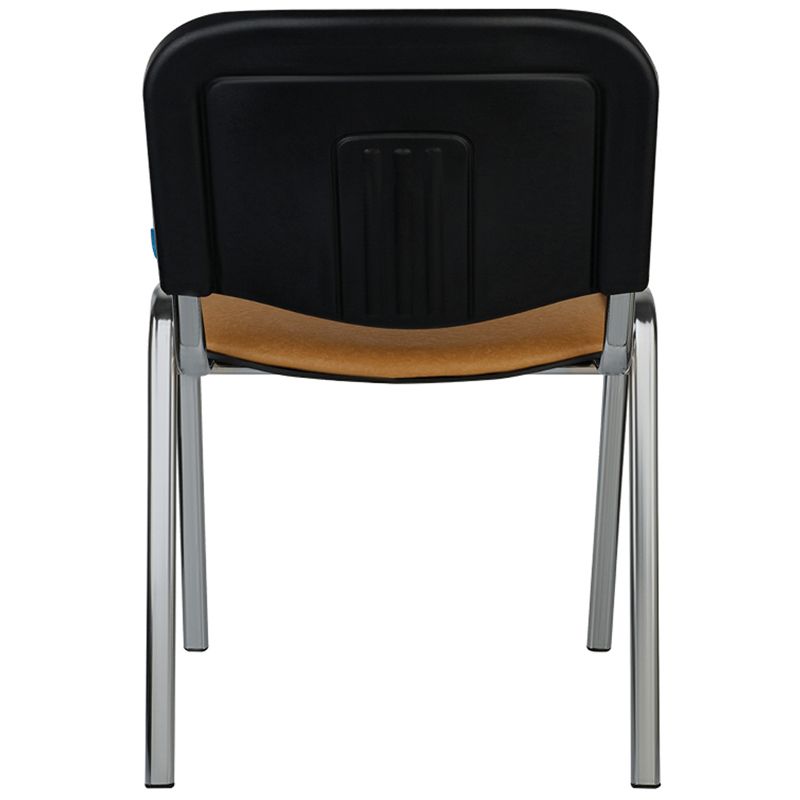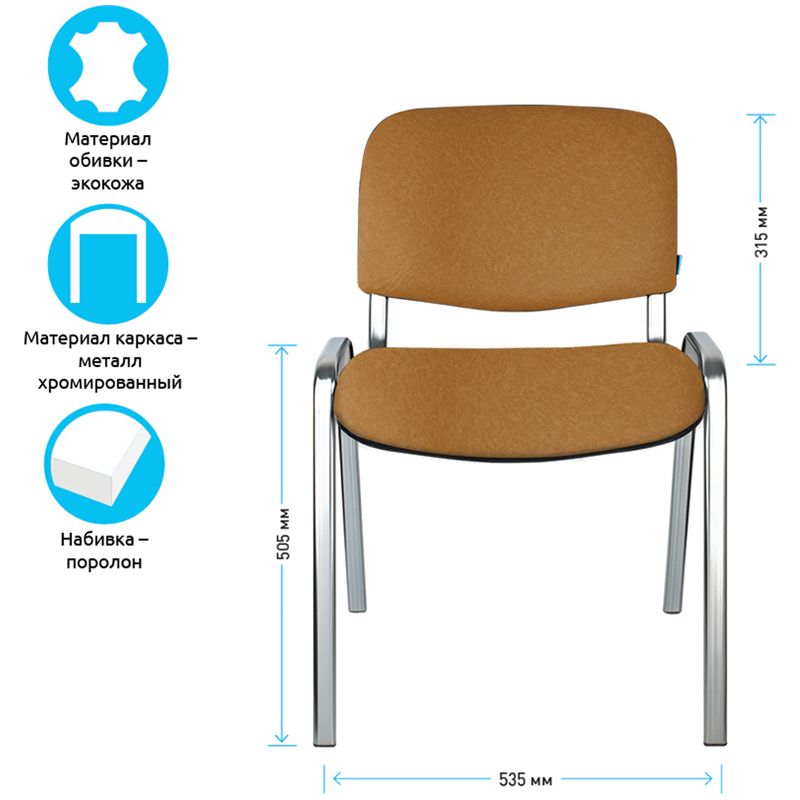 Набивка – высокоупругий поролон. Каркас – устойчивая металлическая конструкция. Ножки и дуги – плоскоовальная труба сечением 30х15 мм и толщиной стенок – 1,2 мм. Покрытие рамы – хром и обладает высокой твердостью и износостойкостью, защищает поверхность металла от коррозии, что способствует увеличению срока службы в несколько раз. На ножках есть пластиковые заглушки. Спинка сзади и сиденье снизу закрыты пластиковыми чехлами. Он подходит не только для офисных помещений, но и для заведений общественного питания, гостиниц, конференц-залов или как компьютерный стул для дома. Конструкция каркаса позволяет убирать стулья в стопки для экономии пространства.