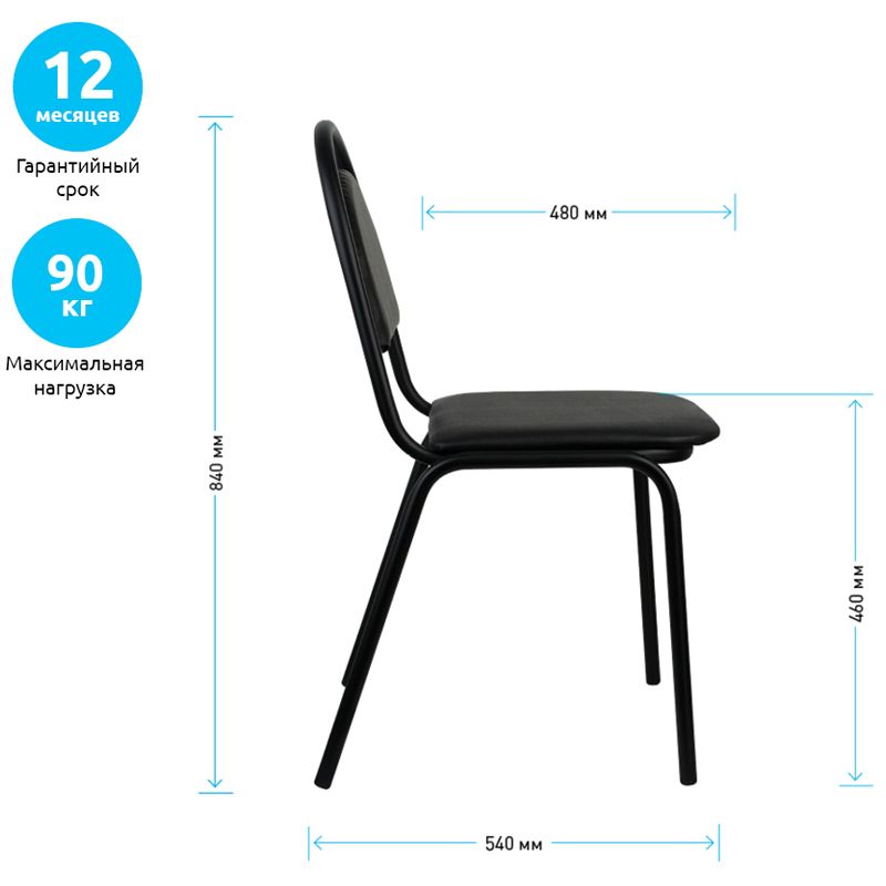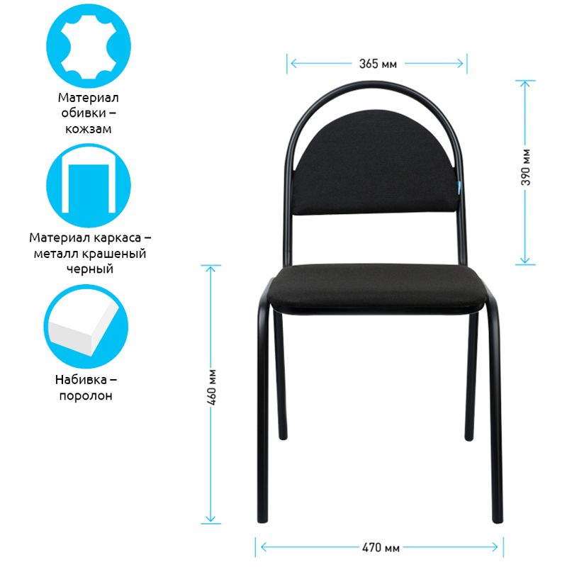 Металлокаркас выполнен из круглой трубы диаметром 22 мм. Сиденье и спинка выполнены из фанеры толщиной 8 мм, наполнение — пенополиуретан. Сиденье снизу закрыто спанбондом. Покрытие рамы -– термореактивная порошковая краска чёрного цвета, стойкая к царапинам и сколам. На ножки установлены пластиковые заглушки, придающие устойчивость и защищающие напольное покрытие от истирания. Конструкция позволяет убирать стулья в стопки для экономии пространства. Стул «Стандарт» – мебель универсального назначения. Он используется не только для офиса, но и для любых помещений с большой проходимостью.