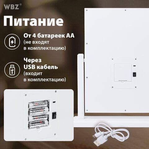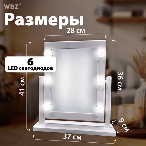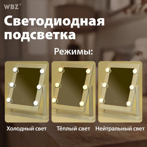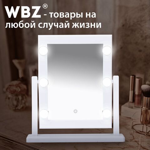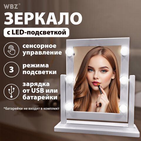 Зеркало для макияжа гримерное, 6 LED-ламп, 3 режима свечения, размер 21х29 см, работа от USB или 4хAA, цвет белый, WBZ, 609334