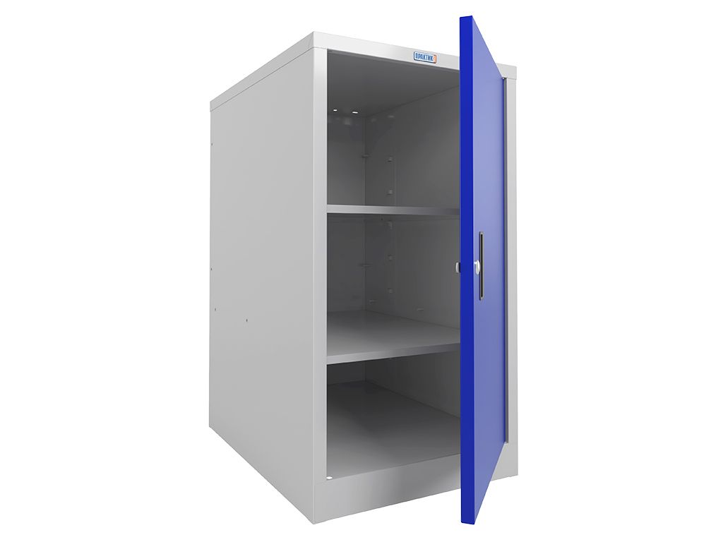 - Верстак окрашен порошковой краской, цвет покрытия корпуса серый шагрень (RAL 7038), лицевая панель дверцы тумбы – синий шагрень (RAL 5002)