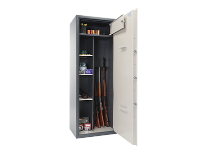 Для служебного и боевого оружия. Используются на охранных объектах, полицейских участках, военных базах. Отличаются усиленной конструкцией, системами контроля доступа и возможностью хранения большого количества единиц.