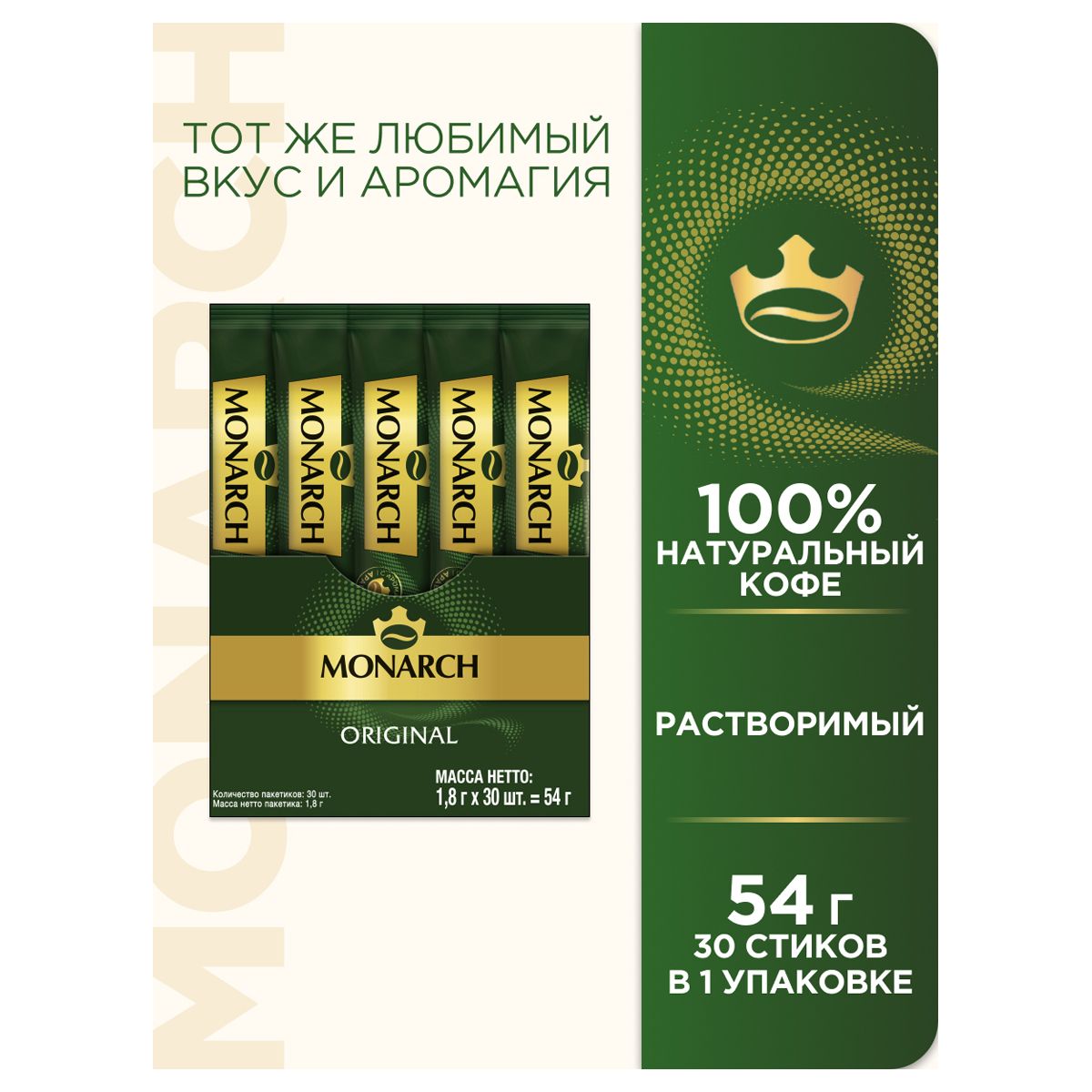 Кофе растворимый Monarch "Original", гранулированный, порционный, 30 пакетиков*1,8г