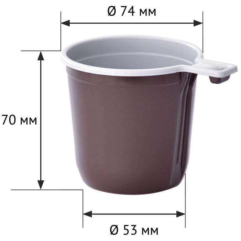 Максимальная температура использования до +90°С. Верхний диаметр чашки - 74 мм. Нижний диаметр чашки - 57 мм. Высота чашки - 70 мм. Вес 1 чашки - 7 гр.