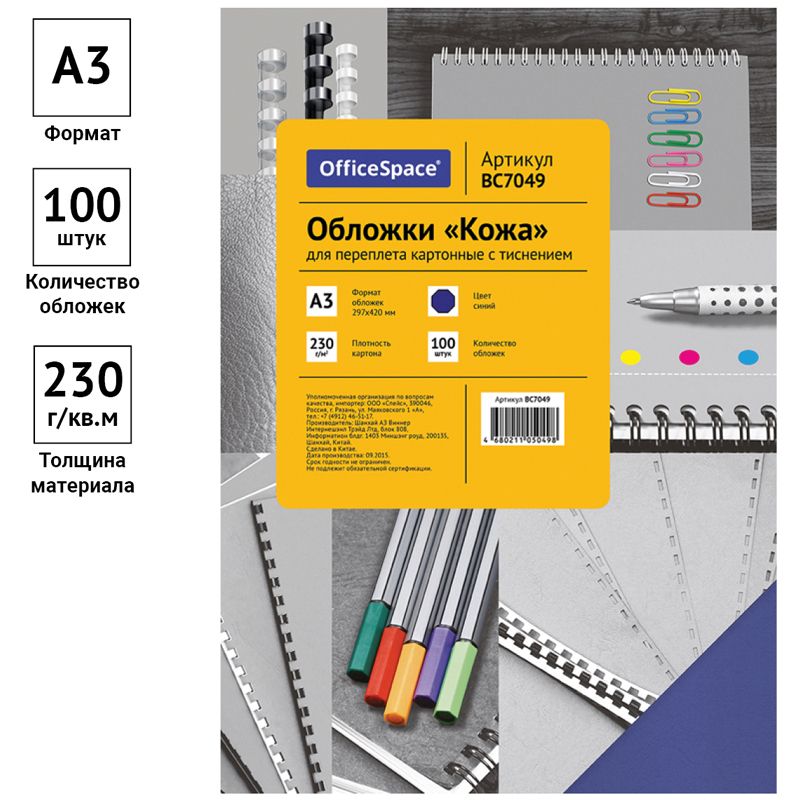 Обложка А3 OfficeSpace "Кожа" 230г/кв.м, синий картон, 100л.