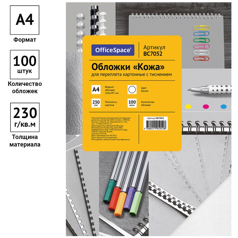 Обложка А4 OfficeSpace "Кожа" 230г/кв.м, белый картон, 100л.