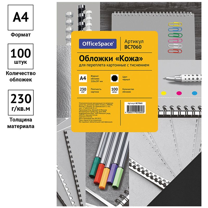 Обложка А4 OfficeSpace "Кожа" 230г/кв.м, черный картон, 100л.