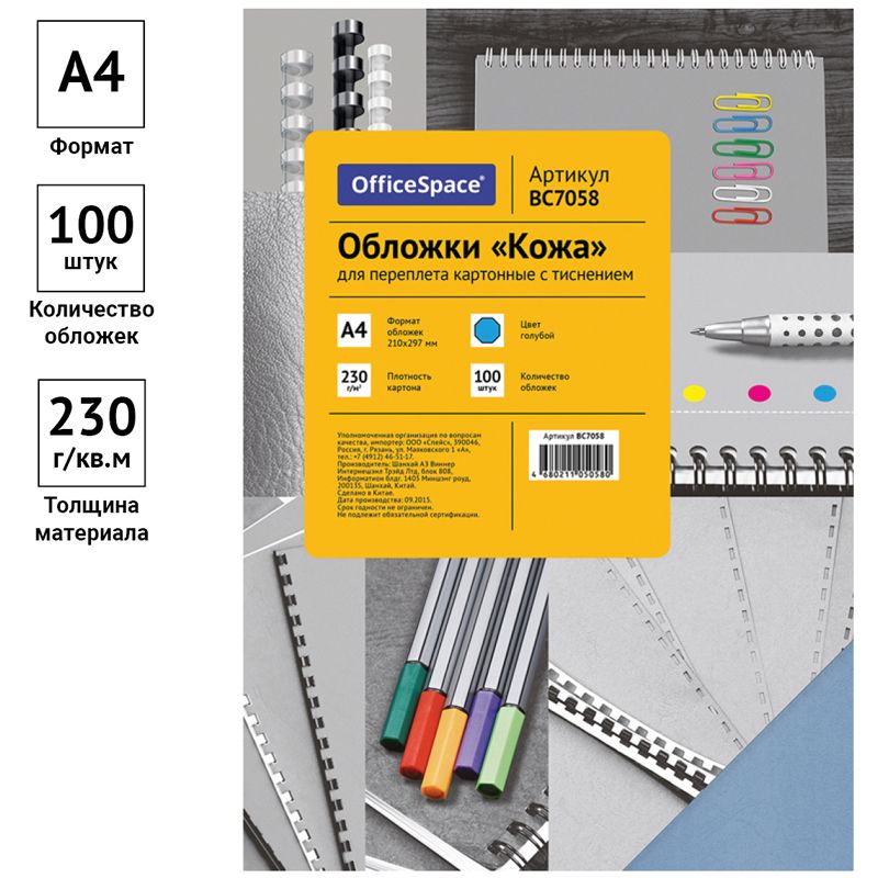 Обложка А4 OfficeSpace "Кожа" 230г/кв.м, голубой картон, 100л.