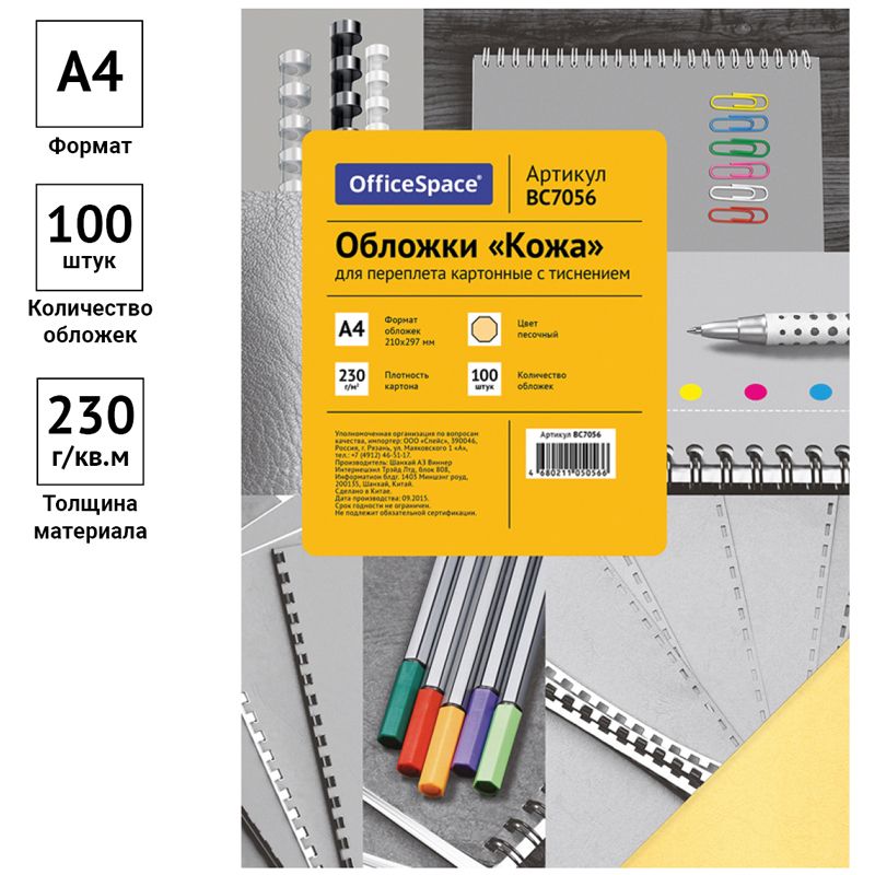 Обложка А4 OfficeSpace "Кожа" 230г/кв.м, песочный картон, 100л.