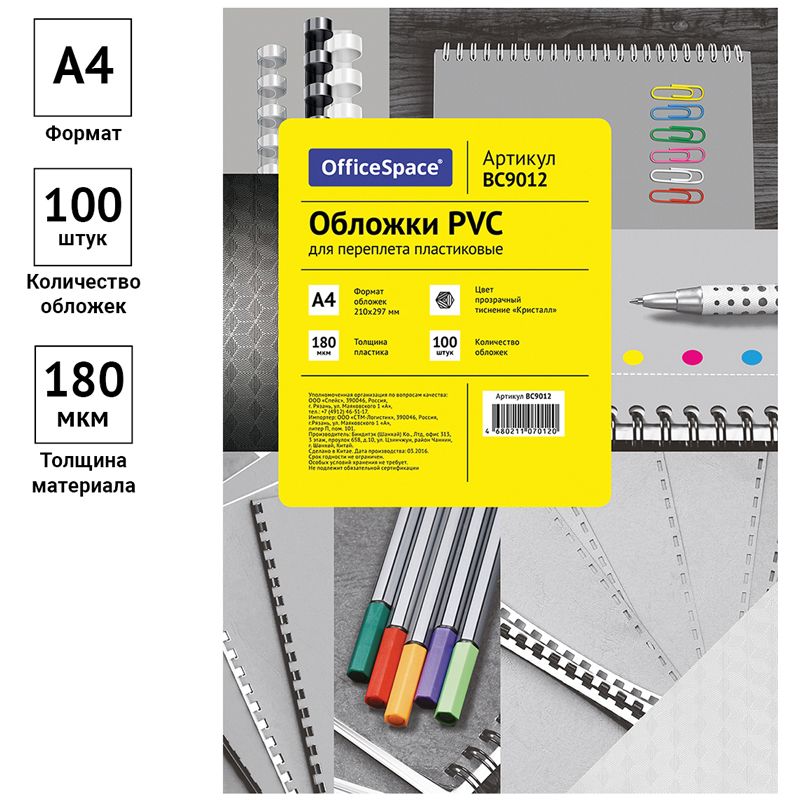 Обложка А4 OfficeSpace "PVC" 180мкм, "Кристалл" прозрачный пластик, 100л.