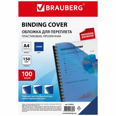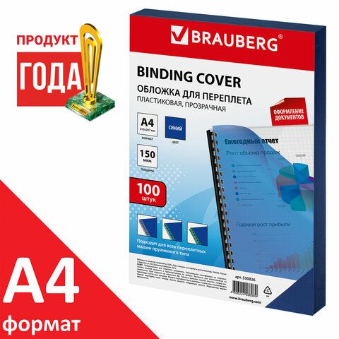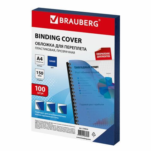 Обложки пластиковые для переплета, А4, КОМПЛЕКТ 100 шт., 150 мкм, прозрачно-синие, BRAUBERG, 530826