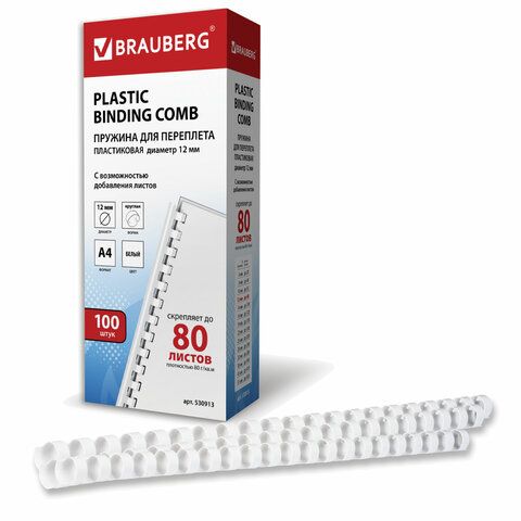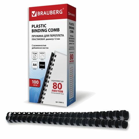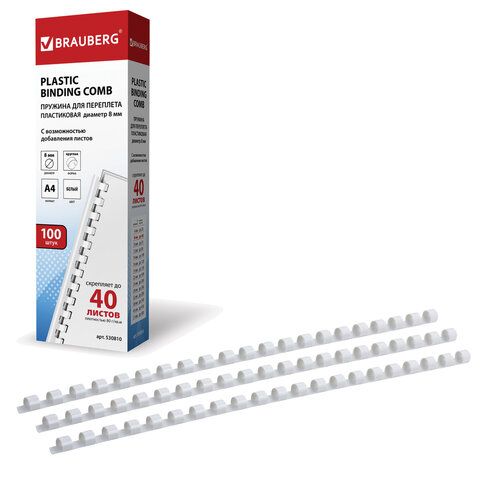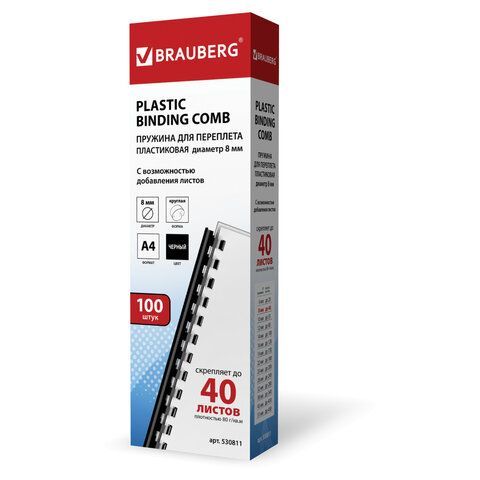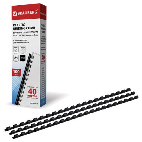 Пружины пластиковые для переплета, КОМПЛЕКТ 100 шт., 8 мм (для сшивания 21-40 л.), черные, BRAUBERG, 530811