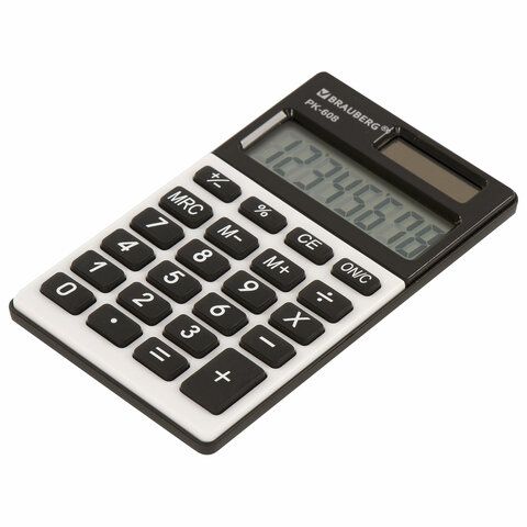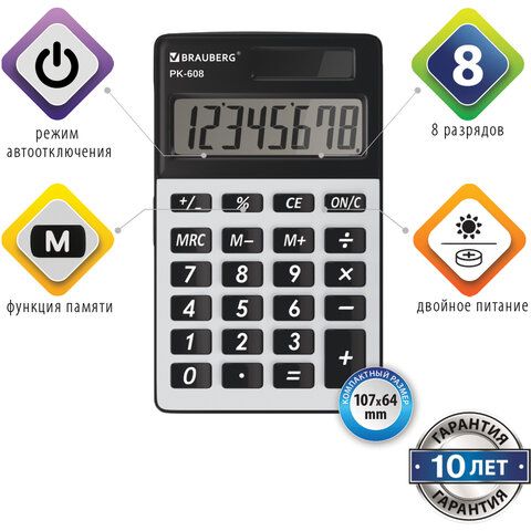 Калькулятор карманный BRAUBERG PK-608 (107x64 мм), 8 разрядов, двойное питание, СЕРЕБРИСТЫЙ, 250518
