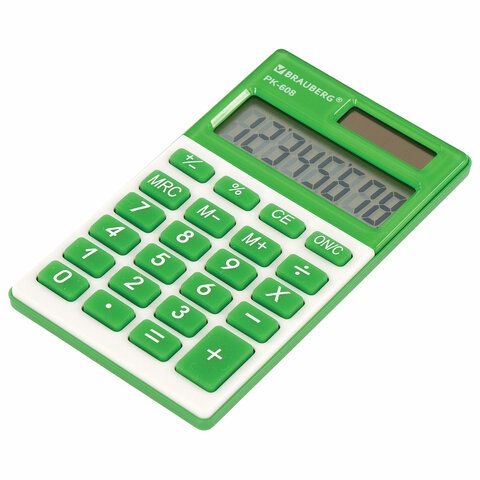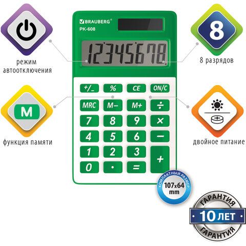 Калькулятор карманный BRAUBERG PK-608-GN (107x64 мм), 8 разрядов, двойное питание, ЗЕЛЕНЫЙ, 250520