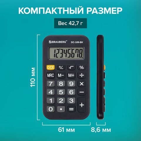 Калькулятор карманный со шнурком BRAUBERG DC-109-BK (61x110 мм), 8 разрядов, ЧЕРНЫЙ, 272642