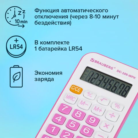 Калькулятор карманный со шнурком BRAUBERG DC-109-WPK (61x110 мм), 8 разрядов, БЕЛЫЙ/РОЗОВЫЙ, 272646