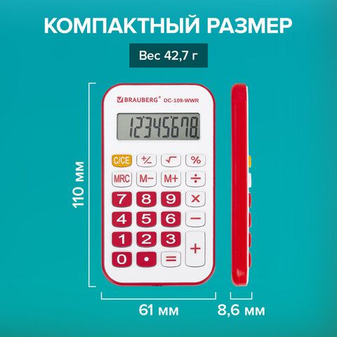 Калькулятор карманный со шнурком BRAUBERG DC-109-WWR (61x110 мм), 8 разрядов, БЕЛЫЙ/КРАСНЫЙ, 272644