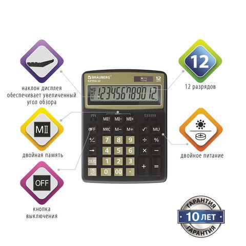 Калькулятор настольный BRAUBERG EXTRA-12-BKOL (206x155 мм), 12 разрядов, двойное питание, ЧЕРНО-ОЛИВКОВЫЙ, 250471