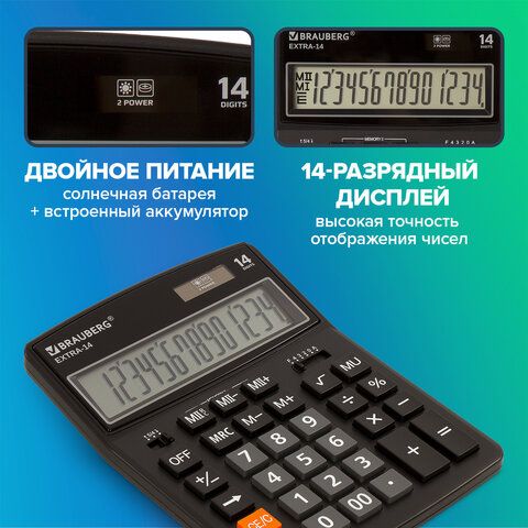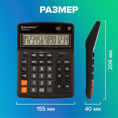 Калькулятор настольный BRAUBERG EXTRA-14-BK (206x155 мм), 14 разрядов, двойное питание, ЧЕРНЫЙ, 250474