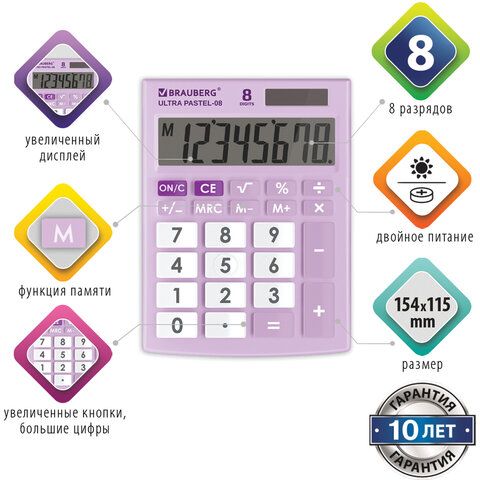 Калькулятор настольный BRAUBERG ULTRA PASTEL-08-PR, КОМПАКТНЫЙ (154x115 мм), 8 разрядов, двойное питание, СИРЕНЕВЫЙ, 250516