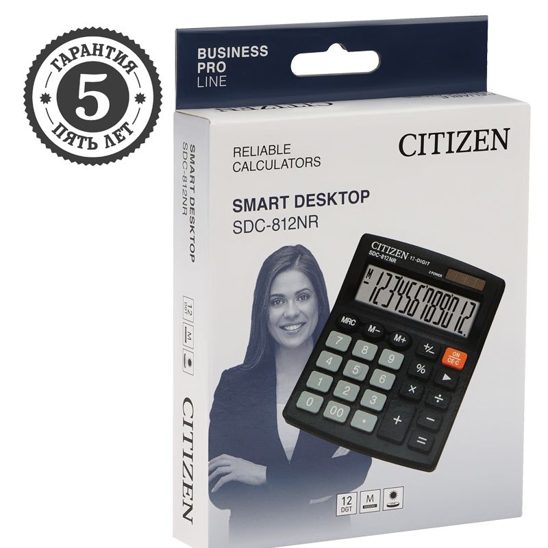 Калькулятор настольный Citizen SDC-812NR, 12 разрядов, двойное питание, 102*124*25мм, черный